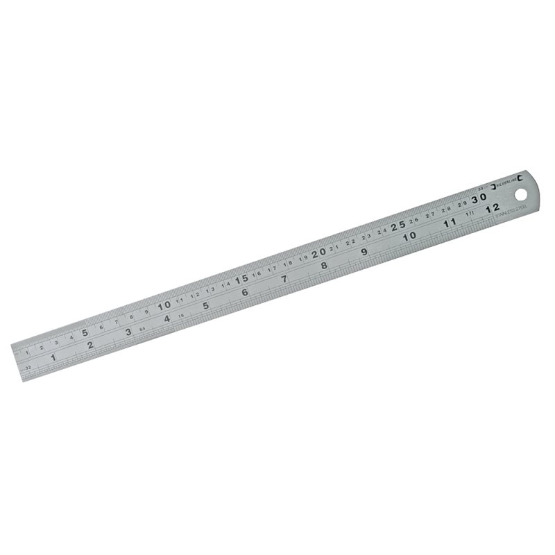 Precision stainless steel rule with clear, etched markings. Metric and imperial graduations: 0.5mm, 1mm and 1cm metric; 1/2", 1/4", 1/8", 1/16", 1/32" and 1/64" imperial, W.W UNF scale and tap drill size table. Includes storage sleeve. Hanging hole for storage.